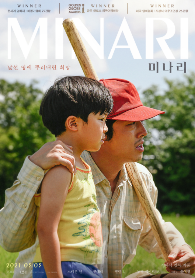 대한민국의 자랑스러운 여배우 오스카조연상의 주인공 배우 윤여정님의 출연작 미나리, 출시 이전부터 개인적으로도 엄청 관심이 많았어요 영화관에서 너무 보고싶었지만 끝이 안보이는 코로나로 때문에 영화관에서 상영 하는건 무리가 있을거 같아서 집에서 VOD 구매로 편하게 보게 되었습니다. 국내는 물론 국외에서도 이렇게 사랑받는 한국 영화가 기생충 이후에 오랜만이기도 했고 K-무비 역시 힘이 여전히 대단하다는걸 느꼈네요. 배우 윤여정님을 비롯하여 옥자와 버닝에 출연하여 우리에게 익숙한배우 스티븐연과 극적인 하룻밤, 더테이블,챔피언 등 한국에서 많은 영화에 출연하여 얼굴을 알렸던 배우 한예리님도 함께 하게 되었습니다. 영화 미나리는 전 세계가 기다린 한국 가족의 희노애락을 담은 이야기입니다. "미나리는 어디서든 잘 자라" 낯선 미국땅 기회의땅, 아칸소로 떠나온 한국 가족. 가족들에게 뭔가 한번쯤이라도 스스로 해내는 모습을 보여주고 싶은 아빠 '제이콥'(스티븐 연)은 자신만의 농장을 손수 계획하고 만들어 나가기 시작한다. 엄마 '모니카'(한예리)도 생계를 위하여 일자리를 찾고 둘은 병아리 암수 구분을 하며 생계 유지를 하며 아칸소의 생활을 시작하고있다. 아직 어린 아이들을 위해 ‘모니카’의 엄마 ‘순자’(윤여정)가 머나먼땅 아칸소로 찾아온다. 가방 가득 한국에서 들고온 고춧가루, 멸치, 한약 그리고 미나리씨를 담은 할머니가 도착하면서 이야기는 점차 시작된다. 의젓한 큰딸