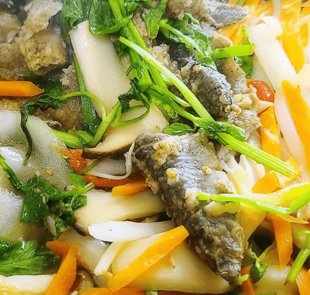 암숙회는 고명으로 미나리가 가득 올려진 냄비가 있는데 미나리를 걷어보면 미꾸라지 보다 덩치가 큰 알이 찬 암컷 미꾸라기가 가득 들어 있습니다.