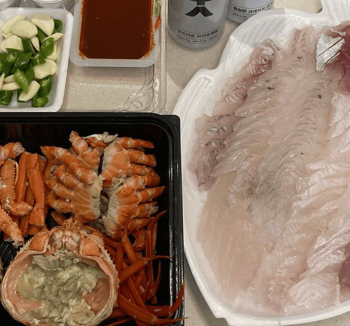 한상 가득 차려진 식탁에 음식이 정갈하게 담겨 있었습니다. 새콤한 회무침도 너무 새콤달콤 맛있고, 회또한 쫄깃쫄깃 맛있었답니다.