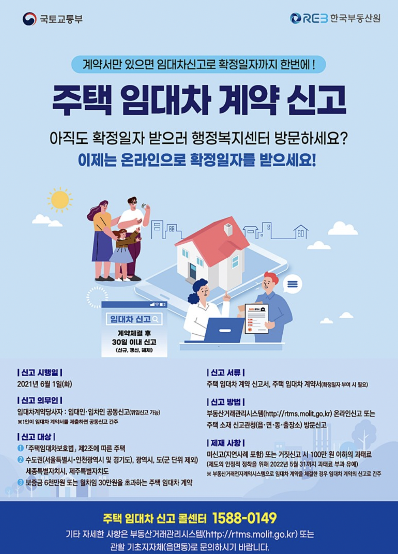 이와같은 정책이 5월 31일이면 끝이나고 미처 신고하지 않는다며 앞서 말씀드린 100만원 해당하는 과태료를 물게 됩니다. 꼼꼼하게 꼭 체크해보셔야 할 문제입니다. 신고 의무자는 임대인 암치인이 계약 체결일 기준으로 30일 이내에 공동으로 신고를 해야하고 신고 주택은 주택임대차 보호법 법상 주택입니다.